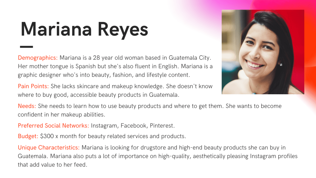 After I gathered all the information I got creative filling in my persona’s demographics, pain points, needs, preferred social networks, budget, and unique characteristics.