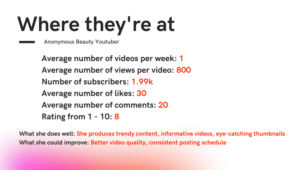 For my competitor analysis, I took a similar approach and template that I did with my audits. I added a ‘what they do well/could improve’ category at the bottom of the analysis to get some ideas on what to implement and what not to implement. I picked competitors that have similar content to mine and that have a similar follower count to mine for a more accurate and helpful analysis.
