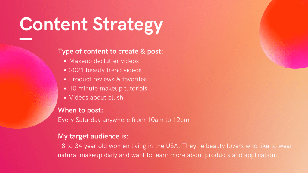 Before taking on this project, I wasn’t sure a social media marketing strategy was right for me because I didn’t have customers and wasn’t trying to sell anything through social media. And even though my goal is not to get more customers I want my platforms to grow and I want people to engage with my content. A strategy like this one has given me all the data and a plan to make that happen.
