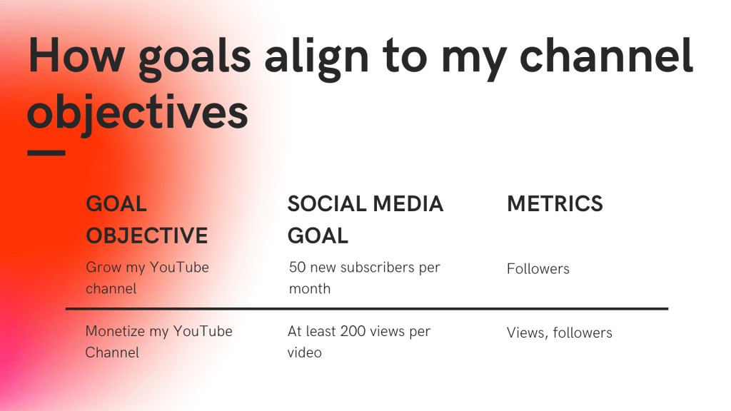 To better understand my goals I also made a ‘how goals align to my platform objectives’. I took my smart goals and defined what the objectives are and the metrics I’m gonna use to measure my progress. I would say this isn’t a necessary part of a strategy but in my case, it gave me a wider understanding of why I set those goals and what I need to focus on to see improvement.